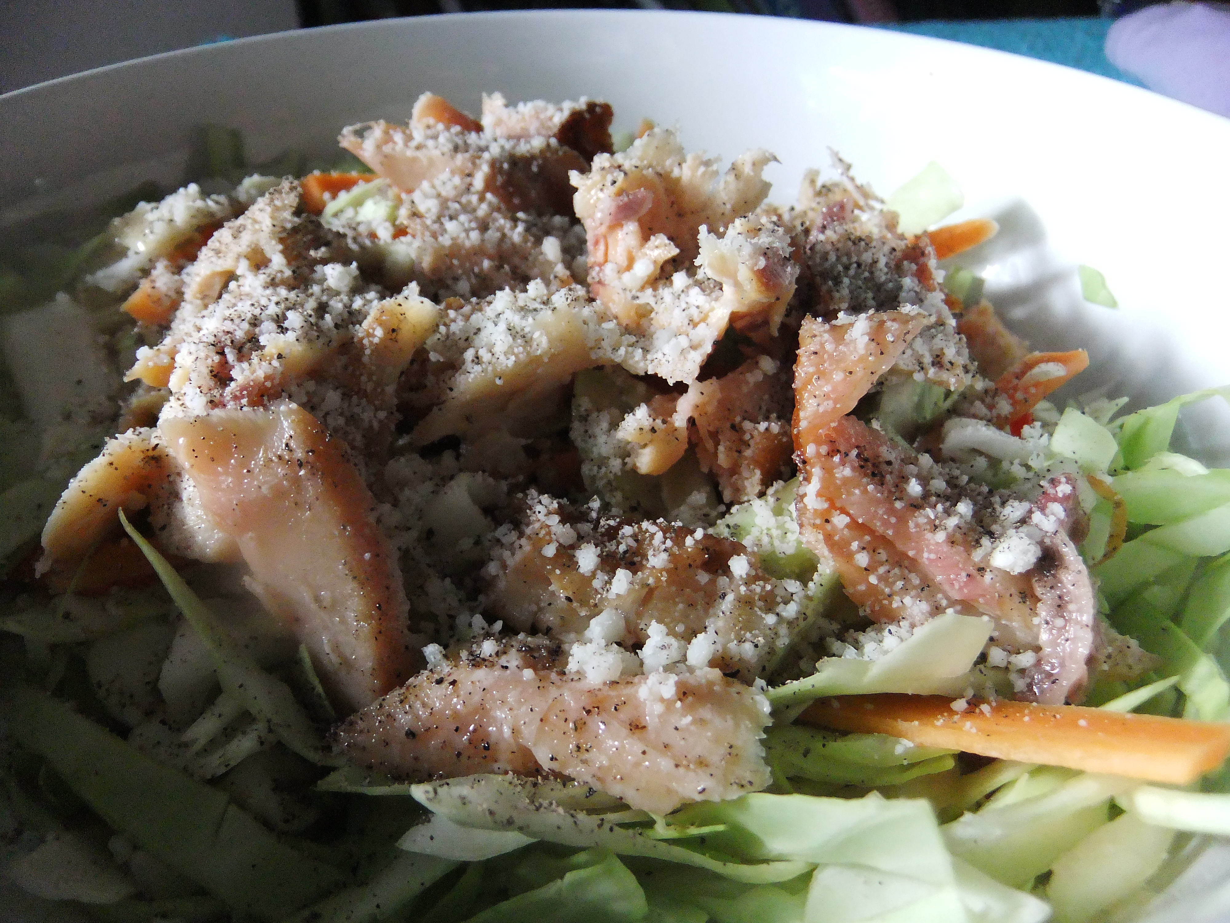 Chop enough fresh cabbage to make a good serving of salad. Cut a rough julienne of about two carrots per salad and toss them on top. Next, crumble smoked fish on top. I divvied up the hunk I bought into four serving sizes since four of us were eating, but I’d say roughly 1/2 to 1 cup of fish per salad. Top with dressing – I used Newman’s Own Caesar, which was an awesome match flavor-wise, but of course you could make a dressing at home. Just make sure it’s a nice, light dressing so it doesn’t overpower the fresh tastes in the salad – only enough to enhance. Last it gets a hearty sprinkle of Parmigiano or Romano and fresh cracked black pepper.